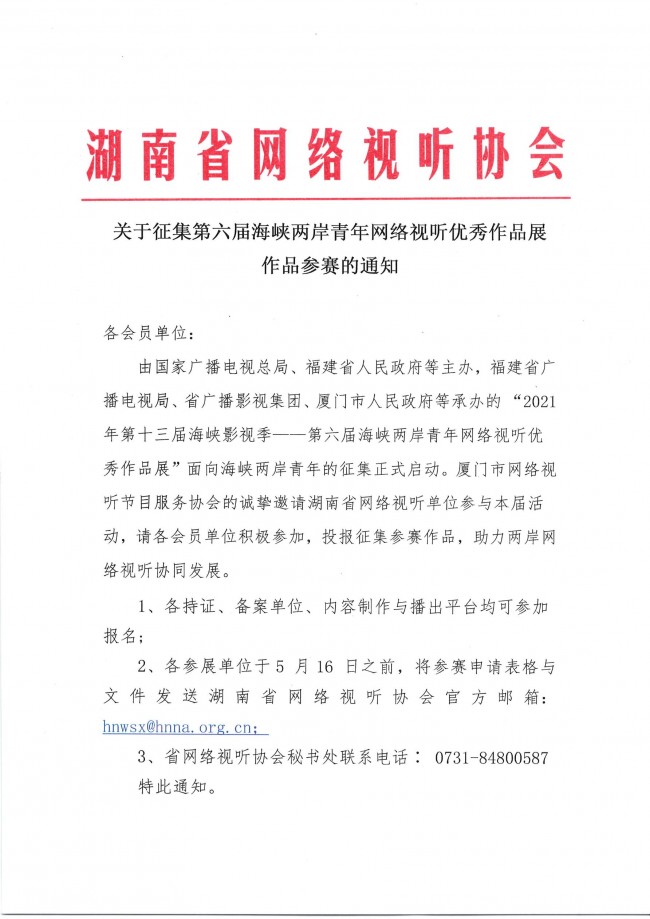 關(guān)于征集第六屆海峽兩岸青年網(wǎng)絡(luò)視聽優(yōu)秀作品展 作品參賽的通知
