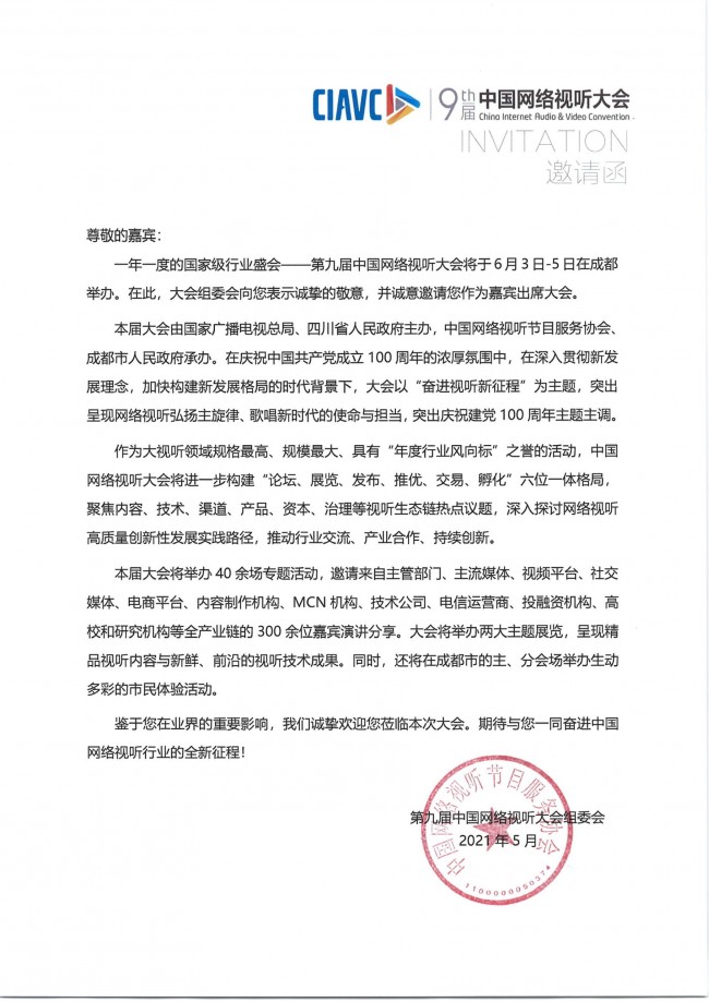 第九屆中國網(wǎng)絡(luò)視聽大會(huì)邀請函及參會(huì)須知
