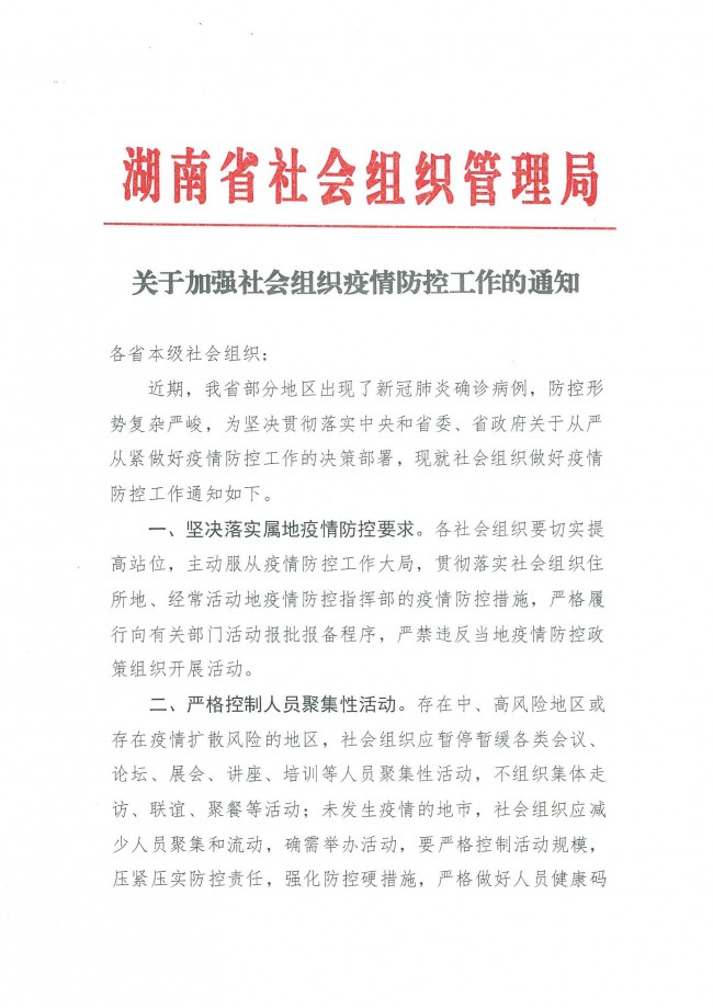 [重要通知]湖南省社會組織管理局《關于加強社會組織疫情防控工作的通知》