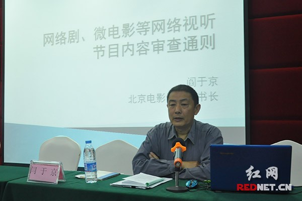 (北京電影協(xié)會(huì)秘書(shū)長(zhǎng)、北京市廣播影視作品審查中心原主任閆于京講授第一節(jié)課《網(wǎng)絡(luò)劇、微電影等網(wǎng)絡(luò)視聽(tīng)節(jié)目?jī)?nèi)容審查通則》。)