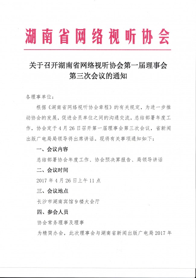 湖南省網(wǎng)絡視聽協(xié)會第一屆理事會第三次會議通知