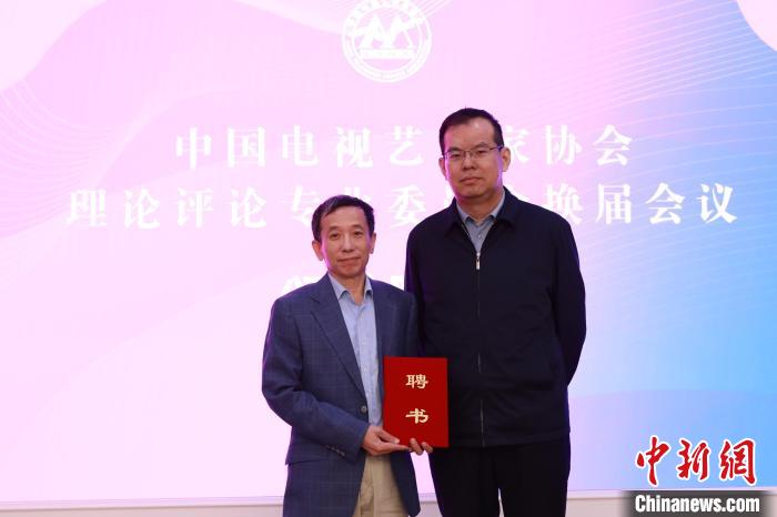 中國視協(xié)分黨組成員、副秘書長董濤(右)為王一川頒發(fā)聘書 中國電視藝術(shù)家協(xié)會理論評論專業(yè)委員會供圖