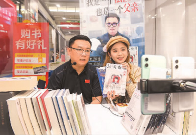 2023年10月28日,中國黃山書會主會場,作家秦明(左)通過直播向消費(fèi)者推介書籍。