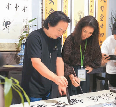 巴西泰坦尼制作有限公司制作人莉莉安娜·羅查·卡瓦薩(右)在廣東珠海北山社區(qū)體驗書法。
