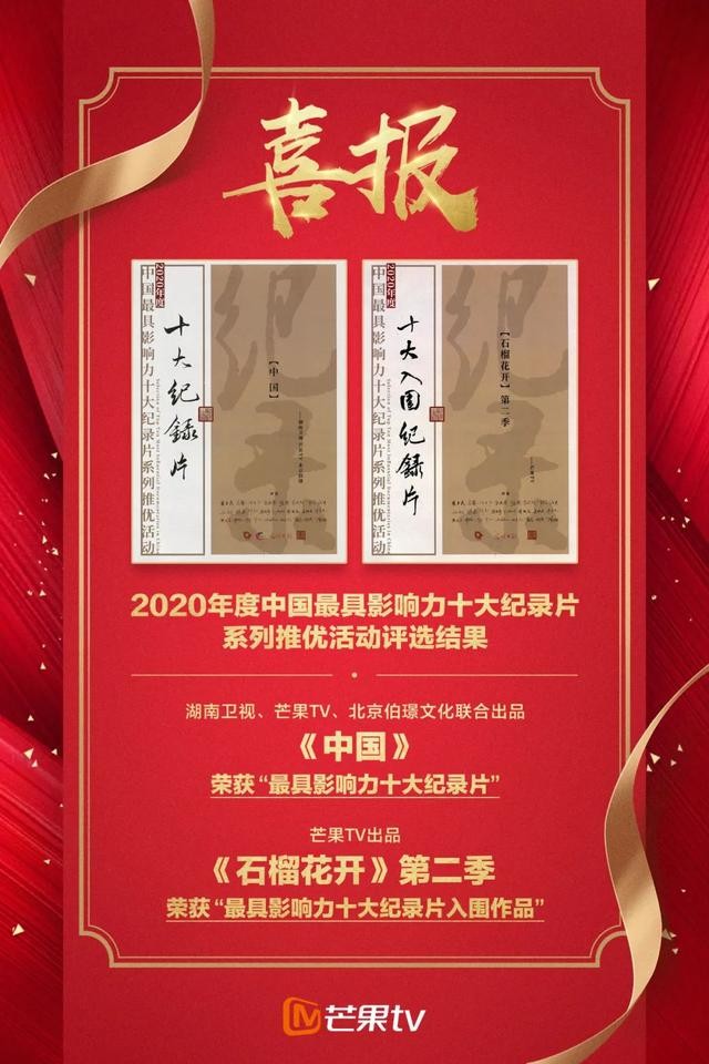 近日,由中國廣播電影電視報刊協(xié)會、光明日報文藝部、中廣聯(lián)合會紀錄片委員會、紀錄中國理事會聯(lián)合組織的“2020年度中國最具影響力十大紀錄片系列推優(yōu)活動”發(fā)布儀式在蘇州黎里古鎮(zhèn)舉行。經(jīng)過嚴格評選,由湖南衛(wèi)視、芒果TV、北京伯璟文化聯(lián)合出品的大型歷史文化紀錄片《中國》榮獲最具影響力十大紀錄片,由中共湖南省委宣傳部、湖南省委網(wǎng)信辦特別指導,湖南省民族宗教事務委員會特別合作,芒果TV出品的致敬脫貧攻堅決戰(zhàn)決勝之年特別節(jié)目《石榴花開2》榮獲2020年度中國最具影響力十大紀錄片入圍作品。