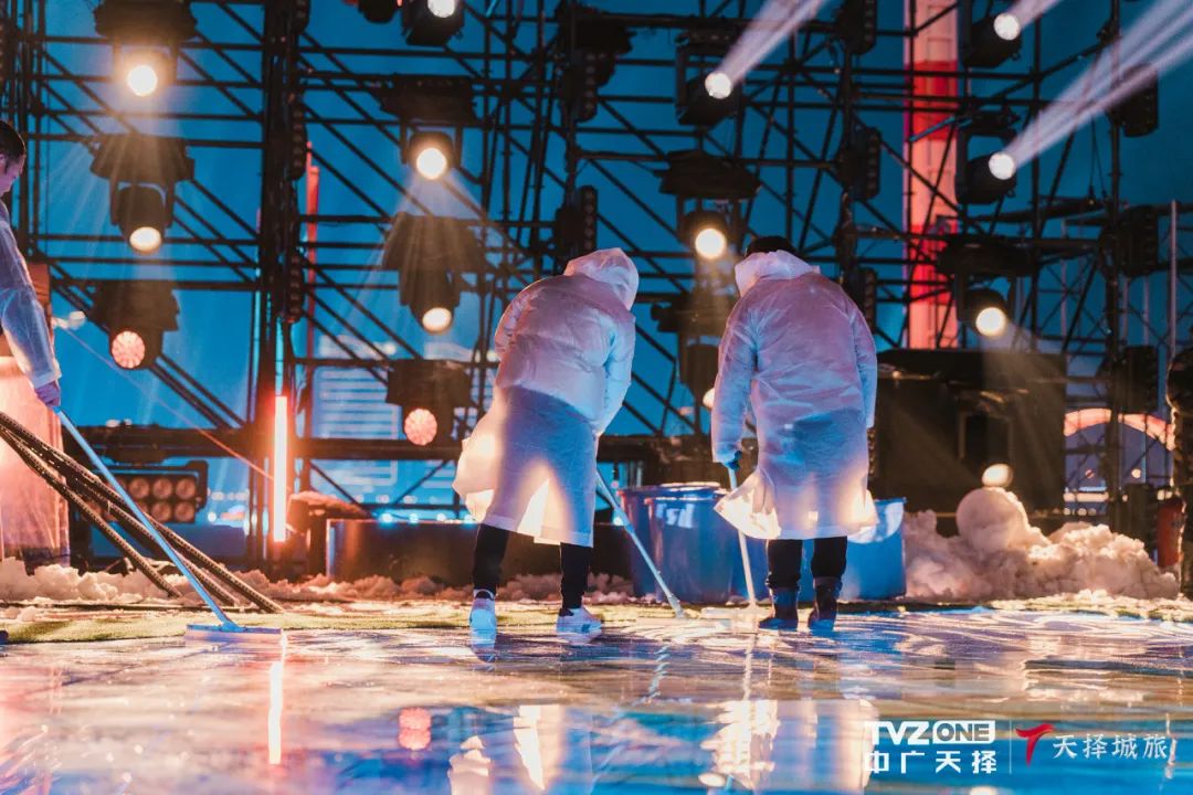 負(fù)責(zé)舞美、舞臺置景執(zhí)行的肖平則認(rèn)為:戶外舞臺,和自然天氣搶時間就是最大的挑戰(zhàn)。比如舞美設(shè)計(jì)中星光點(diǎn)點(diǎn)的花海和花路,是由許多個螢火蟲燈組成,需要提前定制,團(tuán)隊(duì)全渠道全方位尋找有能力且有現(xiàn)貨庫存的廠家,從對接、測試、敲定到運(yùn)輸至舞臺現(xiàn)場,全力提速到一周時間完成。除此之外,在此次舞臺的施工期間,大風(fēng)、凍雨、暴雪的天氣頻發(fā),從舞臺臺面防滑處理、防止仿真花淋雨變形處理、舞美置景制作進(jìn)度維護(hù)和撤場等等,中廣天擇團(tuán)隊(duì)所有人員各司其職,最終讓舞臺得到了完美呈現(xiàn)。