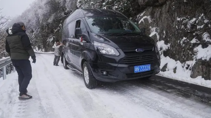 “新春走基層”攝制組在雪峰山錄制山區(qū)老百姓鬧新春的場景時,正值大雪,上山路面結冰,車行困難,攝制組成員齊心協(xié)力推車上坡。