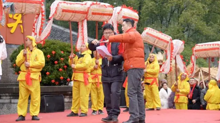 “新春走基層”攝制組在安江農(nóng)校錄制百龍鬧新春,導演呂凌云和主持人萬欣在現(xiàn)場溝通拍攝內容。