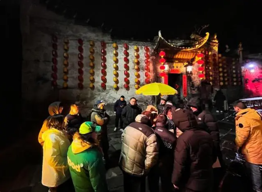 “新春走基層”攝制組在洪江市黔陽古城錄制芙蓉樓詩會,導演孫洪濤現(xiàn)場溝通拍攝細節(jié)。