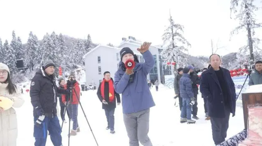 “新春走基層”攝制組在雪峰山錄制山區(qū)老百姓鬧新春的場景時,正值大雪,導演白云龍在現(xiàn)場組織拍攝。