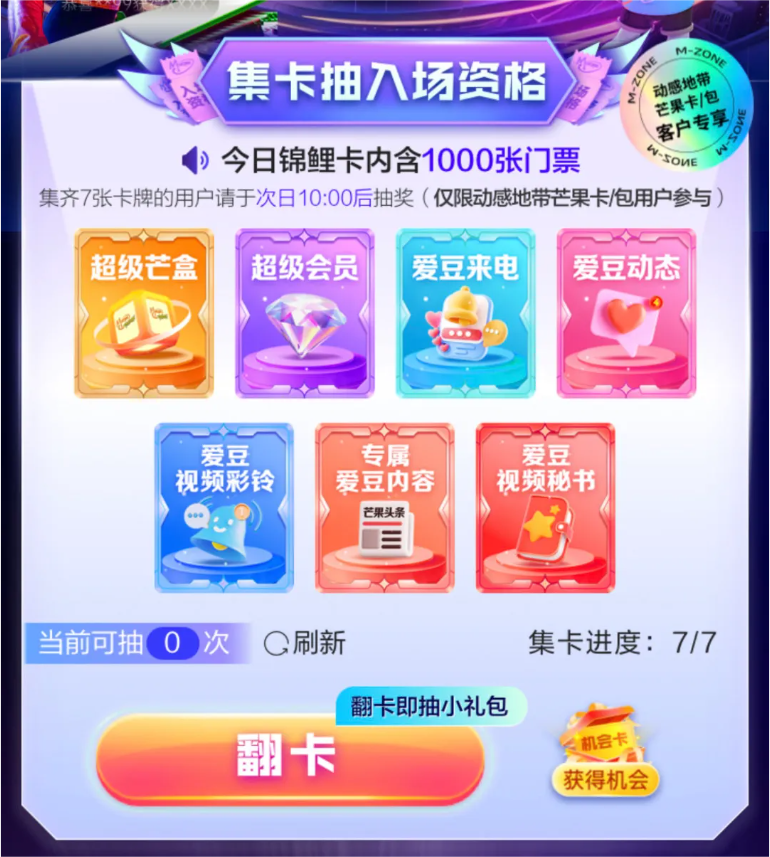 此外,動感地帶芒果卡還為用戶策劃了“集卡抽入場資格”的活動,充滿趣味與挑戰(zhàn)?;顒悠陂g,用戶登錄后可獲取1次翻卡機會,每次翻卡可獲得1張卡牌,并隨機抽取日常獎品??ㄅ瓢凑展潭樞虬l(fā)放,不重復獲得。用戶可通過完成集卡任務獲得更多翻卡機會,在活動前已完成任務的用戶點擊任務按鈕后,增加一次翻卡機會。完成6次任務,任務入口關閉,用戶最多可獲得7次翻卡機會。每次翻卡必得1張卡牌,集滿7張卡牌后,不再下發(fā)翻卡次數(shù)。集滿全套卡牌(7張)后,自動合成錦鯉卡。活動全程,用戶限合成1張錦鯉卡,合成后次日10:00至活動結束前均可開獎,錦鯉包開獎必得1張基礎通信資源,有概率在此基礎上獲得入場資格。