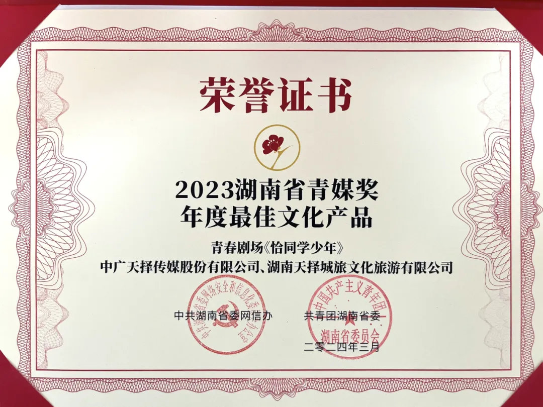 其中,中廣天擇榮獲“年度YOUNG伙伴”,中廣天擇旗下天擇城旅出品的《恰同學少年》青春劇場榮獲“年度最佳文化產(chǎn)品”,這是繼《我的夢想我的城》第二季獲2022年湖南省青媒獎“年度最佳文化產(chǎn)品”后,天擇項目再次獲評該項榮譽。