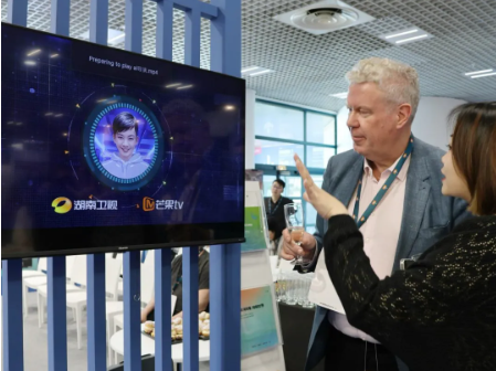 由湖南廣電推出的中國首個AI導(dǎo)演愛芒,在推介會上用中英雙語自我介紹時,就吸引了各國媒體同行、記者和觀眾駐足關(guān)注。