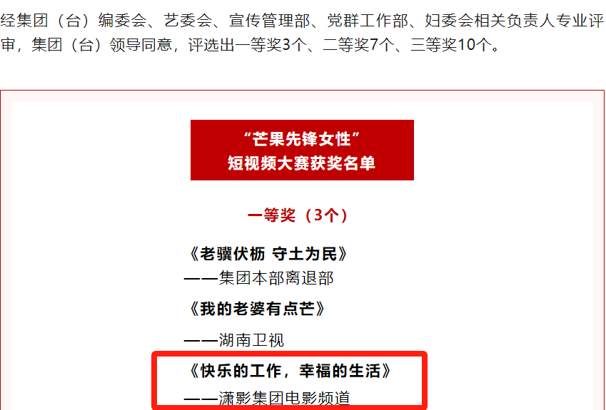 瀟湘電影集團:湖南電影頻道短視頻作品《快樂的工作,幸福的生活》獲芒果先鋒女性短視頻大賽一等獎