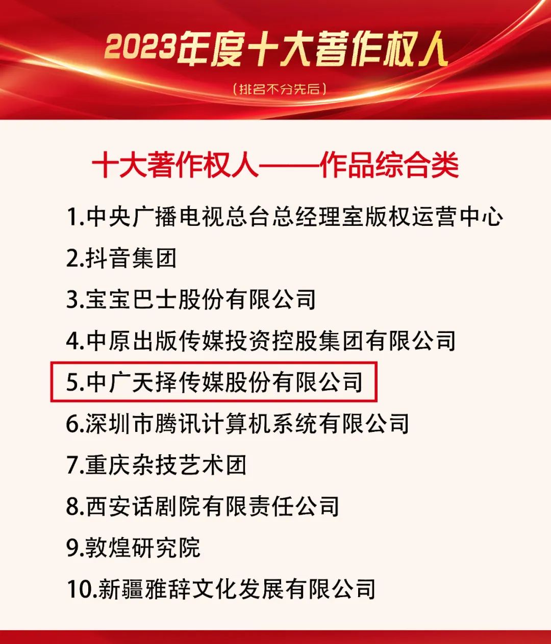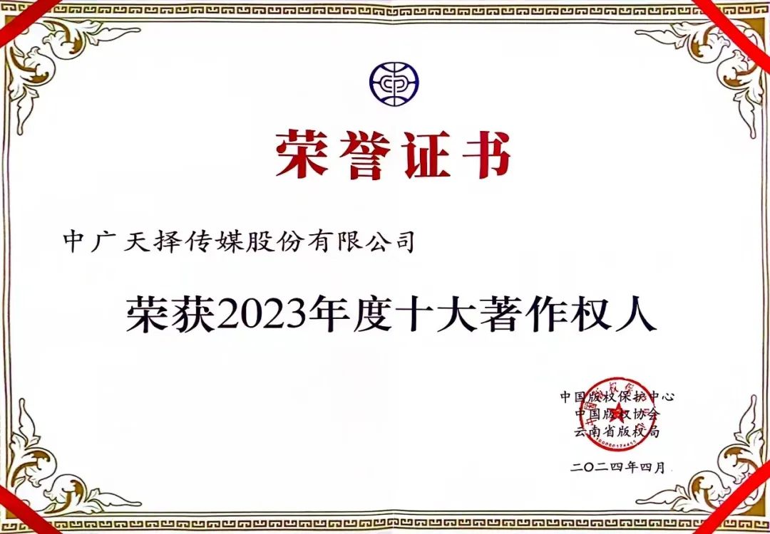 評(píng)委會(huì)從全國(guó)候選人中遴選出計(jì)算機(jī)軟件類、作品美術(shù)類、作品綜合類共3組,每組10名,共30名。中廣天擇此次入選的是“2023年度十大著作權(quán)人”分組名單中的“十大作品綜合類”,這是在第七屆中國(guó)版權(quán)年會(huì)被評(píng)為中國(guó)版權(quán)“最具影響力企業(yè)”、2015年被授予“全國(guó)版權(quán)示范單位”之后,中廣天擇在版權(quán)領(lǐng)域獲得的又一國(guó)家級(jí)榮譽(yù)。