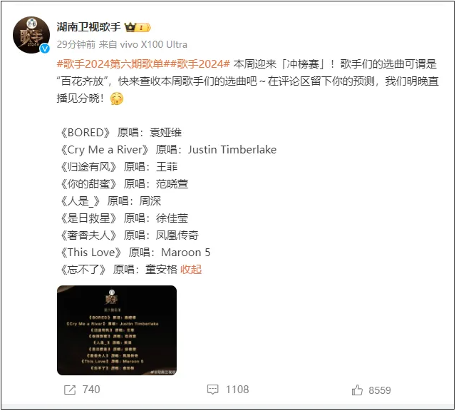 6月13日,《歌手2024》第六期歌單公布!分別為: