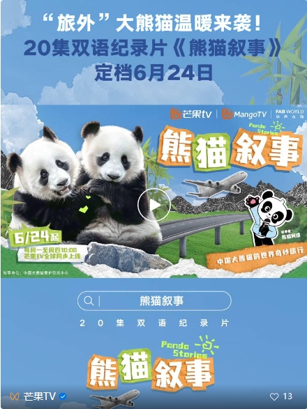 《熊貓敘事》由中國(guó)大熊貓保護(hù)研究中心指導(dǎo),芒果TV和北京華聲志海文化傳播有限公司聯(lián)合出品。節(jié)目以大熊貓文化為核心,生動(dòng)地記錄了中國(guó)大熊貓?jiān)诤M獾纳罱?jīng)歷、生活環(huán)境及與人類發(fā)生的情感鏈接故事,彰顯人與自然和諧共生的深刻理念。該片將于6月24日至7月9日,每周一至周四10:00在芒果TV全球同步上線。
