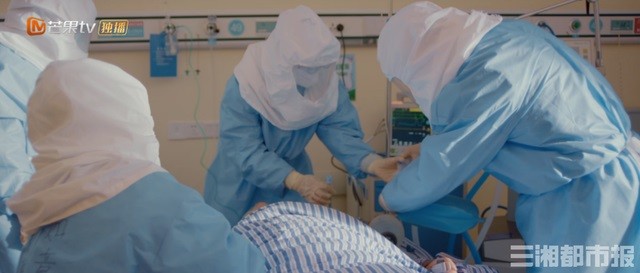 拍攝中,演員們每隔2分鐘就得把面罩拿開透氣,最長的一場戲拍了10分鐘,許多人已經(jīng)大汗淋漓喘不過氣。而真實的醫(yī)護人員在防護服中一待就是四個小時以上,手長時間戴手套導(dǎo)致發(fā)脹,臉被口罩壓皺,護目鏡被霧氣和汗水浸透……在一批又一批的醫(yī)護人員努力下,全國確診人數(shù)不斷減少,治愈率不斷提高……