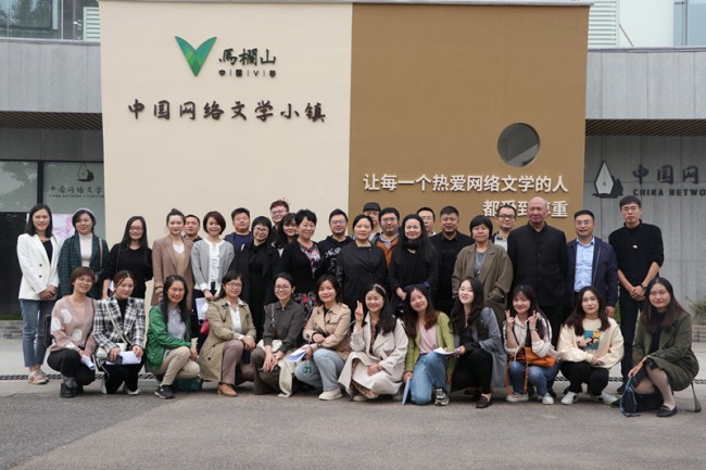 “文創(chuàng)湘軍湖畔沙龍”參與人員合影在中國(guó)網(wǎng)絡(luò)文學(xué)小鎮(zhèn)合影