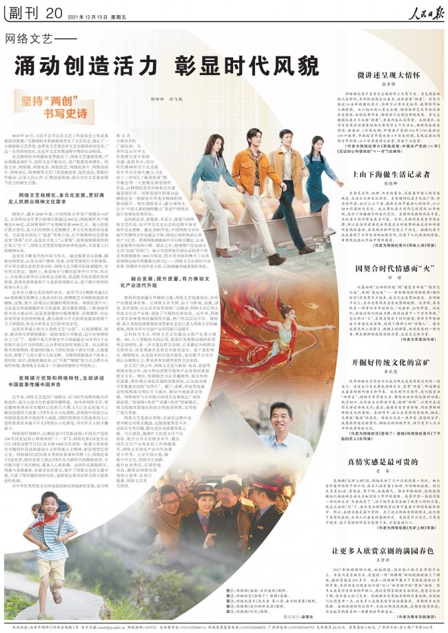 在互聯(lián)網(wǎng)技術(shù)和媒體變革推動(dòng)下,網(wǎng)絡(luò)文藝蓬勃發(fā)展,產(chǎn)業(yè)規(guī)模迅速擴(kuò)大,創(chuàng)作生態(tài)不斷優(yōu)化,用戶數(shù)量顯著增長(zhǎng)。網(wǎng)絡(luò)文學(xué)、網(wǎng)絡(luò)劇、網(wǎng)絡(luò)電影、網(wǎng)絡(luò)綜藝、網(wǎng)絡(luò)紀(jì)錄片、網(wǎng)絡(luò)動(dòng)畫片、網(wǎng)絡(luò)音樂、短視頻等文藝門類創(chuàng)意迸發(fā)、佳作迭出,緊貼時(shí)代脈動(dòng)、記錄人民心聲、匯聚創(chuàng)造熱情,成為當(dāng)代文藝富有朝氣活力的新生力量。