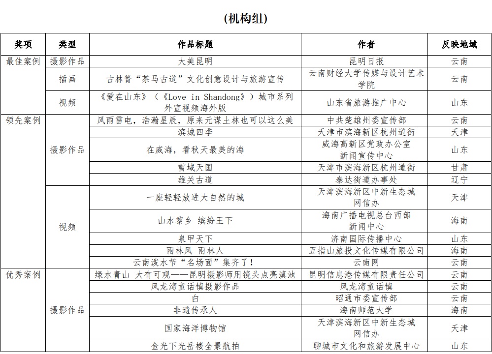 機(jī)構(gòu)組最佳案例包括昆明日?qǐng)?bào)提交的《大美昆明》(最佳攝影)、云南財(cái)經(jīng)大學(xué)傳媒與設(shè)計(jì)藝術(shù)學(xué)院提交的《古林箐