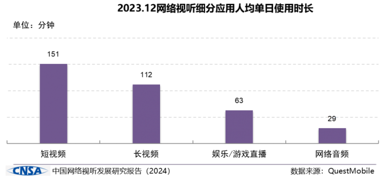 2023年,移動互聯(lián)網用戶人均單日使用時長為435分鐘;移動端網絡視聽應用人均單日使用時長為187分鐘,超過3小時。其中,短視頻應用的用戶黏性最高,人均單日使用時長為151分鐘,隨后依次為長視頻應用(112分鐘)、娛樂/游戲直播應用(63分鐘)和網絡音頻應用(29分鐘)。