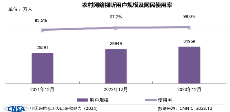 兩年來,網絡視聽用戶增量主要來自農村,網絡視聽在推進鄉(xiāng)村振興戰(zhàn)略走好“最后一公里”中扮演重要角色、貢獻重要力量。2022年、2023年,我國農村網絡視聽用戶規(guī)模分別為2.99億人、3.20億人,同比分別增長12.6%、6.8%,增速遠高于同期城鎮(zhèn)用戶(2.1%、1.9%)。