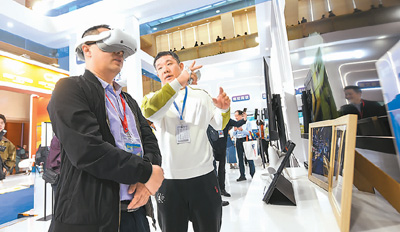 在第十一屆中國(guó)網(wǎng)絡(luò)視聽大會(huì)“新技術(shù)與精品節(jié)目展”現(xiàn)場(chǎng),參展商給參會(huì)者介紹VR虛擬現(xiàn)實(shí)產(chǎn)品。