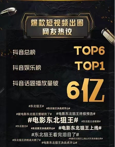 《東北狙王》通過(guò)“以短帶長(zhǎng)”的模式,將項(xiàng)目亮點(diǎn)有節(jié)奏地滲透到目標(biāo)人群,最終獲得短視頻平臺(tái)熱榜榜首以及超6億關(guān)注度的喜人成績(jī),實(shí)現(xiàn)了網(wǎng)絡(luò)電影的精準(zhǔn)營(yíng)銷(xiāo)與高效導(dǎo)流。