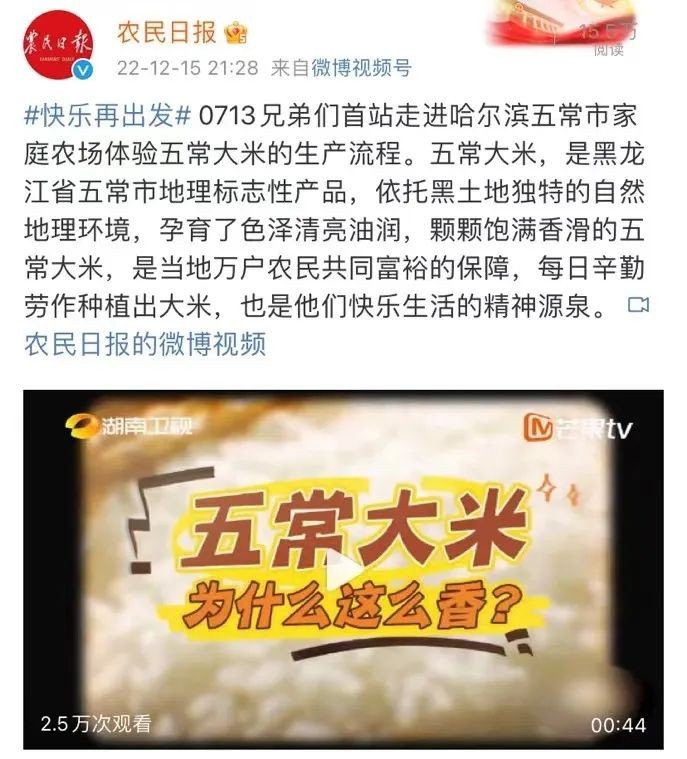 首期節(jié)目中,0713兄弟們走進黑龍江五常大米生產(chǎn)地,走進普通農(nóng)戶王大姐的家中,感受最樸素的勞動快樂,并感染到了以王大姐為代表的農(nóng)民滿足的幸福生活狀態(tài)。首播節(jié)目傳遞的快樂也迅速蔓延全網(wǎng),不僅收獲了收視雙網(wǎng)第一的好成績,全網(wǎng)90個熱搜也再次見證了這股快樂的力量。
