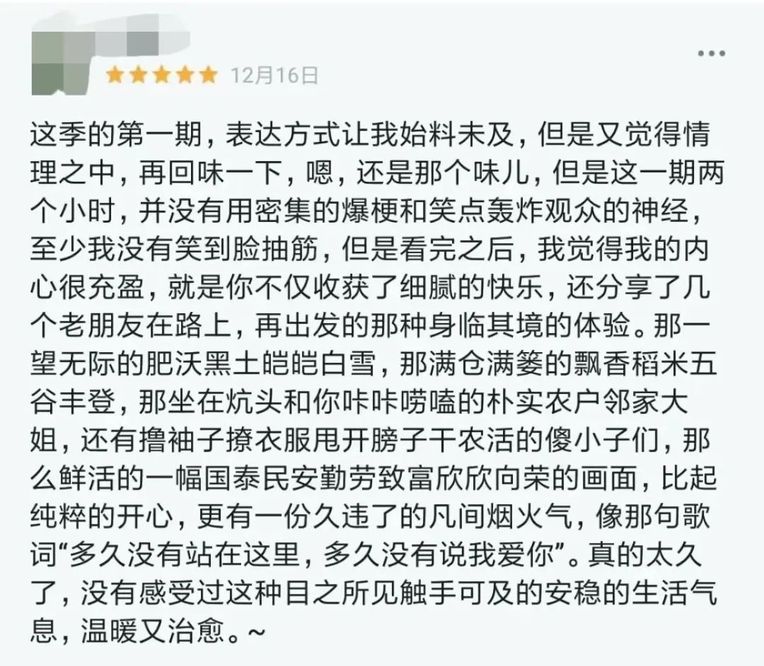 “格局”、“煙火”、“助農(nóng)”、“治愈”等關(guān)鍵詞成為了節(jié)目?jī)r(jià)值和理念的代名詞,節(jié)目通過(guò)東北的美食、旅游、糧倉(cāng)、洗浴等文化維度,讓不少外地觀眾產(chǎn)生旅游向往。有網(wǎng)友評(píng)價(jià)“希望可以打造成一檔長(zhǎng)期的旅游節(jié)目。”本周,《快樂(lè)再出發(fā)》第二季第三期將繼續(xù)深入體驗(yàn)東北得天獨(dú)厚的自然環(huán)境,周四22:00鎖定湖南衛(wèi)視、芒果TV,一起暢享一段絲滑的冰上之旅!