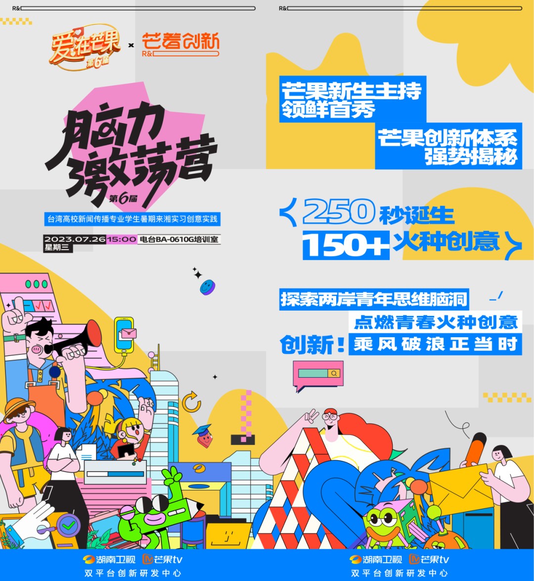 7月26日,雙平臺創(chuàng)新研發(fā)中心聯(lián)合集團(臺)人力資源部和湖南衛(wèi)視人力資源部、主持人管理部、羅煦明團隊舉辦了一場「芒著創(chuàng)新·腦力激蕩營」暨第六屆“愛在芒果”臺灣實習生來湘實習創(chuàng)意實踐活動,組織53名臺灣實習生了解芒果創(chuàng)新體系,體驗創(chuàng)意策劃新方法,探索兩岸青年思維腦洞,為雙平臺創(chuàng)新注入新鮮活力,發(fā)揚“相信年輕,引領年輕”的芒果精神。