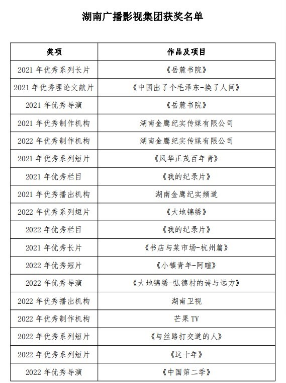 首屆中國紀錄片大會發(fā)布評選結果 湖南廣電獲譽連連據(jù)悉,此次大會發(fā)布的國產(chǎn)紀錄片及創(chuàng)作人才扶持項目評選結果,共分為優(yōu)秀制作機構、優(yōu)秀播出機構、優(yōu)秀欄目、優(yōu)秀系列長片、優(yōu)秀系列短片、優(yōu)秀理論文獻片、優(yōu)秀導演等十二個大類。 其中,湖南衛(wèi)視獲評“優(yōu)秀播出機構”,芒果TV獲評“優(yōu)秀制作機構”,《我的紀錄片》斬獲“優(yōu)秀欄目”,微紀錄片《這十年》《小鎮(zhèn)青年之阿暄》則分別獲評“優(yōu)秀系列短片”和“優(yōu)秀短片”,《中國》第二季獲評“優(yōu)秀導演”。此外,作為湖南廣電旗下的專業(yè)化紀錄片頻道,湖南金鷹紀實頻道獲評“優(yōu)秀播出機構”,其制作的《岳麓書院》《風華正茂百年青》《中國出了個毛澤東·換了人間》等作品也在此次評選中獲譽連連。 發(fā)揮雙平臺優(yōu)勢 湖南衛(wèi)視、芒果TV佳作不斷 觀眾其實不難發(fā)現(xiàn),近年來,始終以人民為中心創(chuàng)作導向的湖南衛(wèi)視、芒果TV雙平臺推出了一系列以真實生活為創(chuàng)作基底,以真人真事為表現(xiàn)對象,傳播弘揚積極向上正能量且具有較高思想性、藝術性和傳播度的精品力作。 探源中華文明的《中國》系列紀錄片展現(xiàn)歷史自信、文化自信新高度,連獲第27屆電視文藝“星光獎” 、第31中國電視金鷹獎最佳電視紀錄片獎等多個國家頂級大獎肯定;《沈從文與湘西》呈現(xiàn)這位世界文學大師與家鄉(xiāng)湘西的一生牽絆之余,片中絢麗多姿的民族文化元素、深厚的歷史文化底蘊、獨特的鄉(xiāng)村文化也頻頻引人贊嘆;《追尋賀龍元帥》通過追尋賀龍元帥的人生軌跡,緊扣“對黨忠誠”的主題,展現(xiàn)他忠于黨、忠于人民、忠于社會主義事業(yè)的崇高品德; 《于青山綠水間》記錄瑤族、東鄉(xiāng)族、納西族、土族、鄂倫春族、羌族、傣族、維吾爾族8個少數(shù)民族同胞在黨的領導下因地制宜發(fā)展鄉(xiāng)村振興的故事,展示了在中國式現(xiàn)代化進程中全面推進的鄉(xiāng)村振興新面貌。
