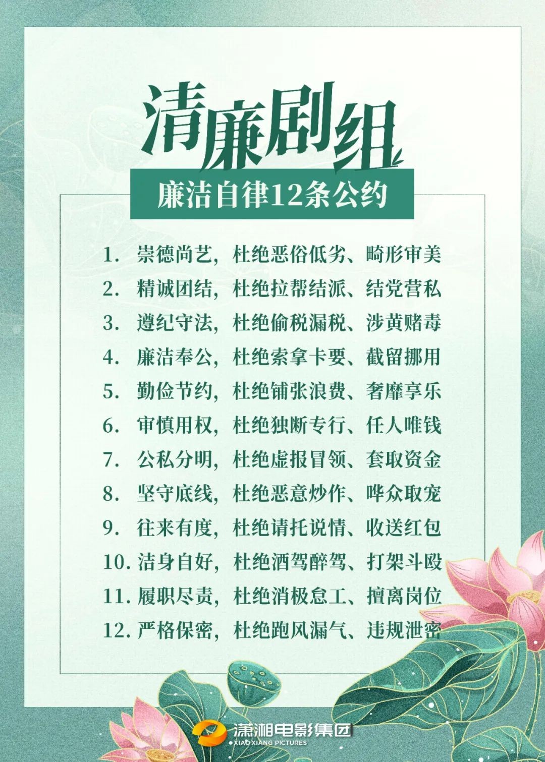 隨后的夏季,圍繞靠企吃企問(wèn)題專項(xiàng)整治,結(jié)合瀟影集團(tuán)實(shí)際,推出“清廉瀟影·‘廉’夏季”。同時(shí),聚焦主業(yè)建設(shè)“清廉劇組”,在橫店《問(wèn)蒼?!穭〗M張貼“廉潔自律12條公約”8張,制作宣傳易拉寶2個(gè),在集中辦公場(chǎng)所設(shè)立廉政信箱,讓廉潔文化深入生產(chǎn)一線,融入基層群眾。