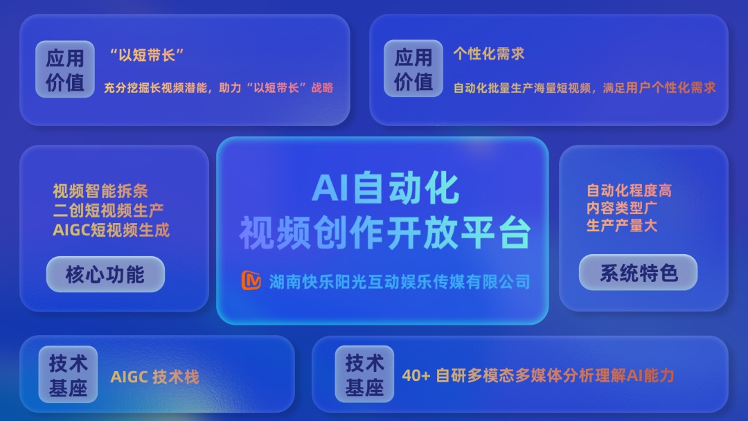 AI自動化視頻創(chuàng)作開放平臺是芒果TV自研的短視頻自動生產(chǎn)平臺,為挖掘湖南衛(wèi)視、芒果TV雙平臺海量長視頻寶藏,生成大量短視頻滿足海量用戶個性化需求,發(fā)揮短視頻與長視頻的聯(lián)動效應,AI自動化視頻創(chuàng)作開放平臺乘風而生。