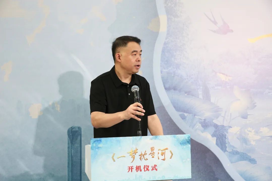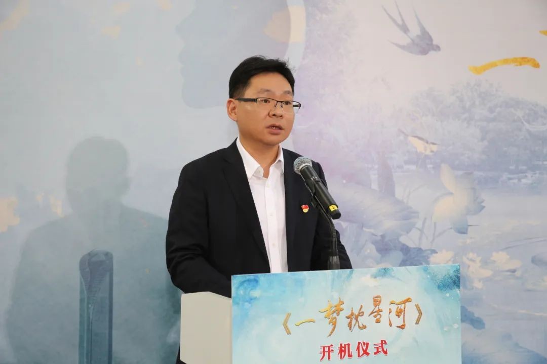 劇組成立臨時黨支部隨著出席領導揭開攝影機的紅綢,巨幅折扇緩緩展開,微短劇《一夢枕星河》的海報逐漸顯露,正式宣告該劇開機。