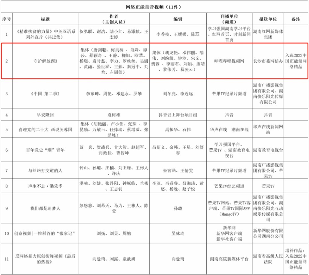 其中,由中廣天擇傳媒、嗶哩嗶哩聯(lián)合出品的《守護解放西3》喜獲佳績,入選網(wǎng)絡正能量音視頻。