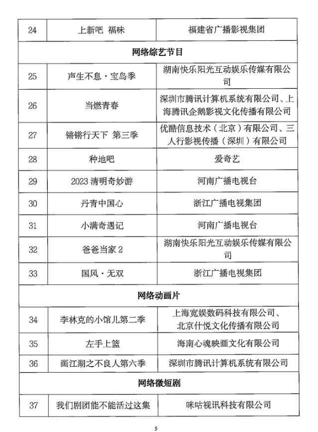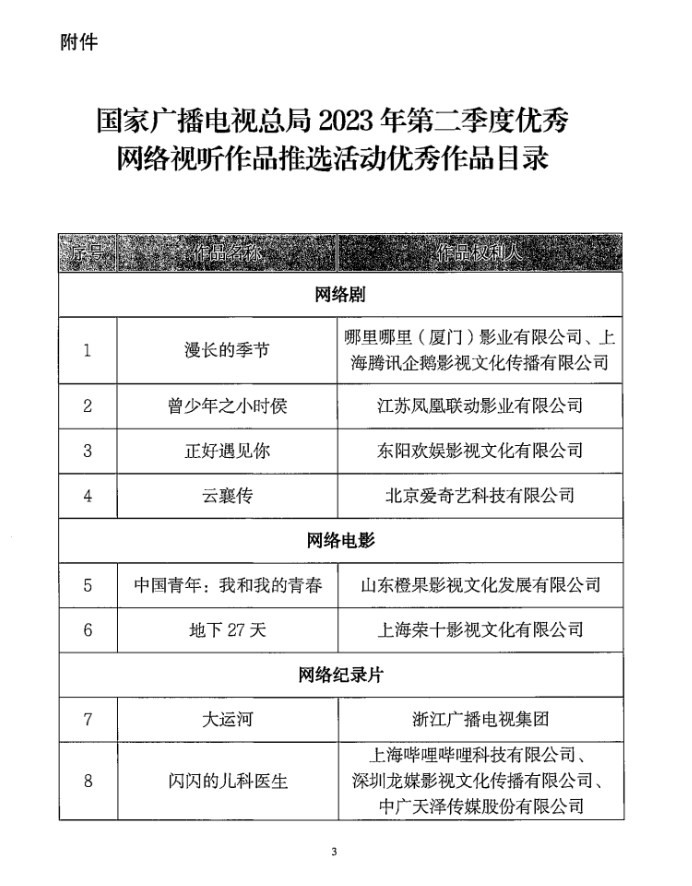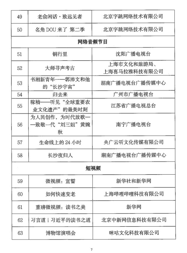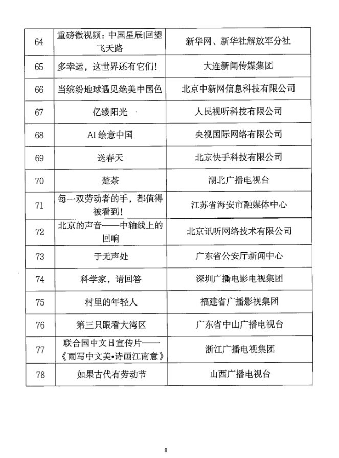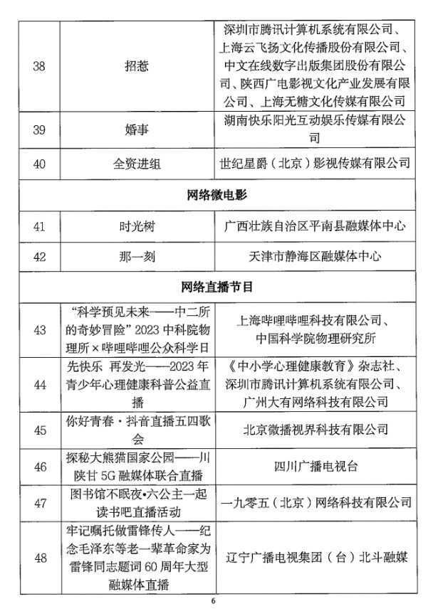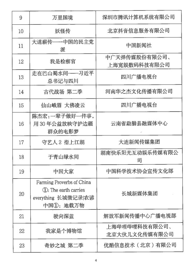 各省、自治區(qū)、直轄市廣播電視局,新疆生產(chǎn)建設(shè)兵團文化體育廣電和旅游局,中央直屬單位《信息網(wǎng)絡(luò)傳播視聽節(jié)目許可證》持證機構(gòu)和備案機構(gòu): 為深入學習貫徹習近平總書記對宣傳思想文化工作的重要指示和全國宣傳思想文化工作會議精神,進一步貫徹落實黨的二十大精神,鼓勵網(wǎng)絡(luò)視聽行業(yè)創(chuàng)作生產(chǎn)高質(zhì)量視聽內(nèi)容,更好發(fā)揮優(yōu)秀網(wǎng)絡(luò)視聽作品的示范引領(lǐng)作用,國家廣播電視總局近期組織開展了2023年第二季度優(yōu)秀網(wǎng)絡(luò)視聽作品推選活動。經(jīng)省級廣電行政部門和中央直屬單位等推薦,專家評審委員會審核,最終確定了78部入選作品,現(xiàn)將結(jié)果予以公布,同時可在國家廣播電視總局政府網(wǎng)站(網(wǎng)址:http://www.nrta.gov.cn)公告公示區(qū)中查詢。