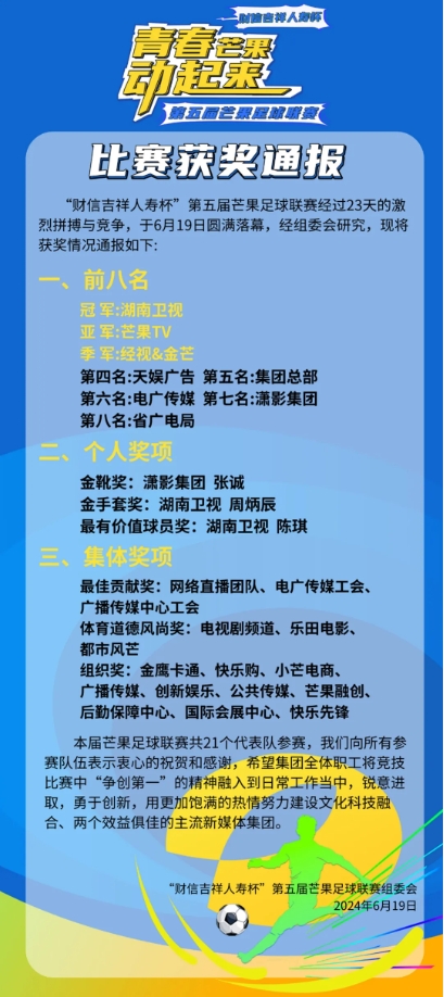本屆芒果足球聯(lián)賽于5月28日開賽,共21支代表隊參賽。在集團(臺)黨委的部署下,組委會精心組織,各單位積極參與,經(jīng)過23個日夜的奮勇拼搏、激烈角逐,最終,湖南衛(wèi)視、芒果TV、經(jīng)視&金芒隊分別榮獲冠、亞、季軍。
